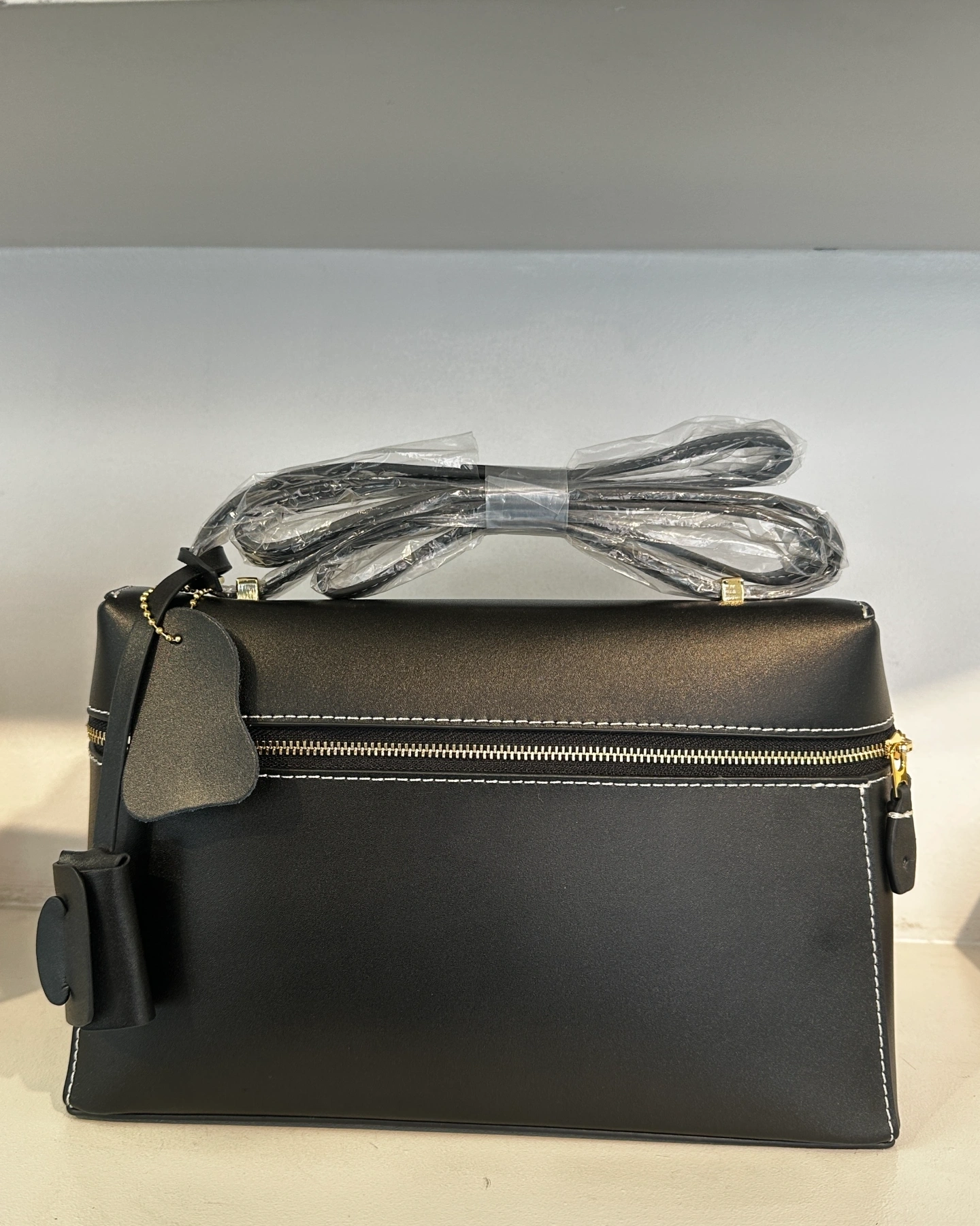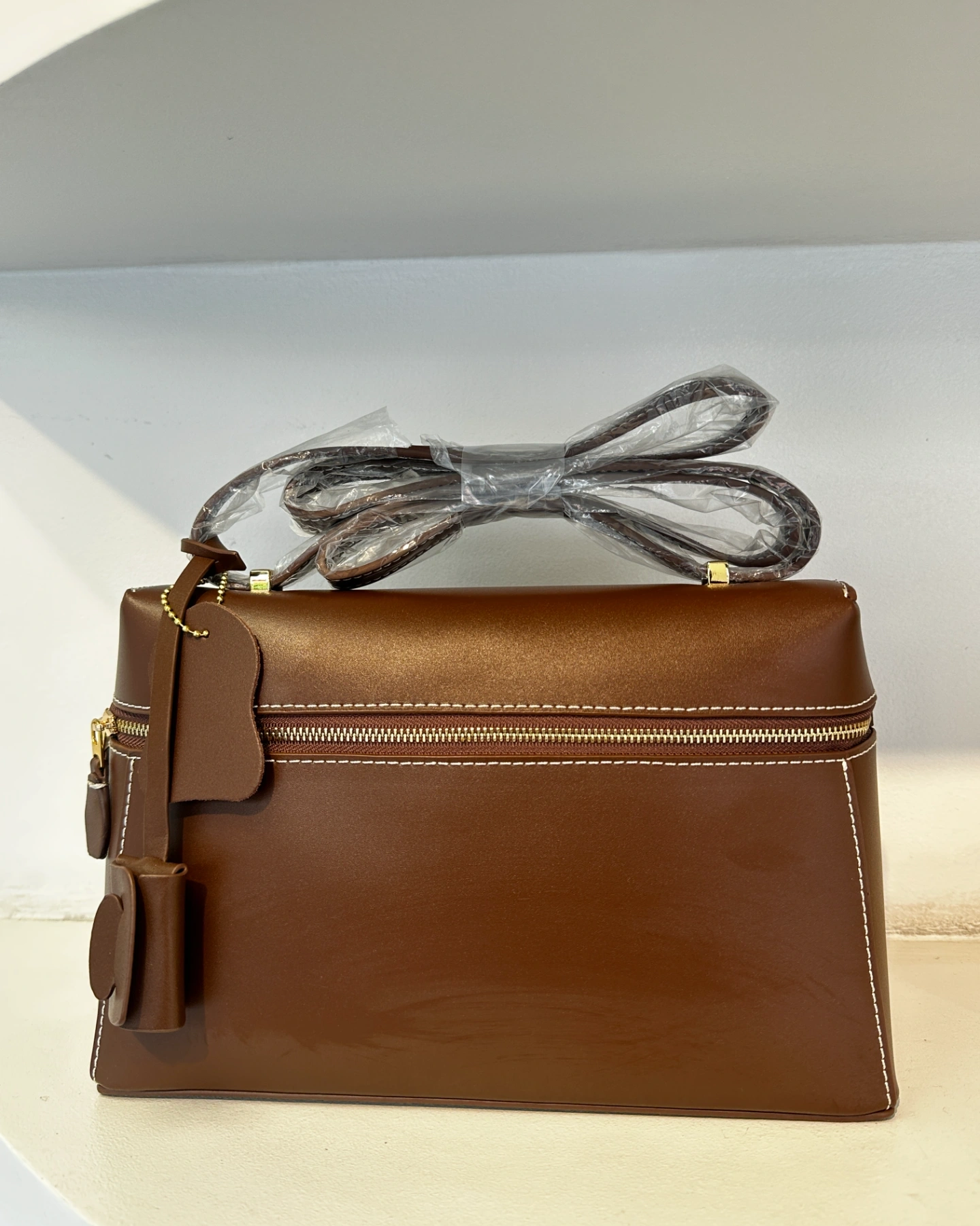 Loro Piana Extra Bag, a structured luxury accessory characterized by its rectangular silhouette, double-zip closure, and distinctive contrast stitching.