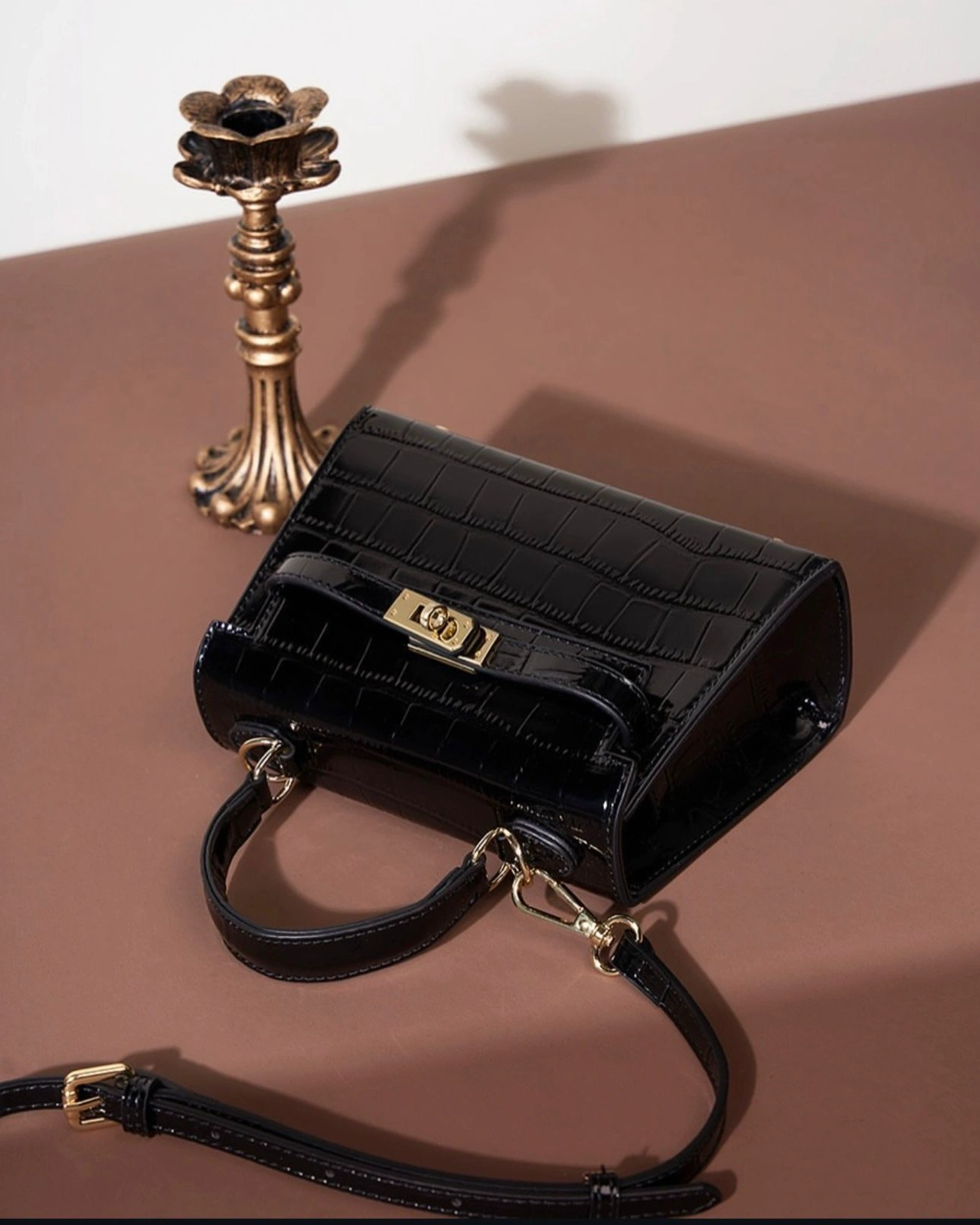 Elegant and compact,this glossy black croc-textured bag is designed for versatile styling.Perfect for elevating both day and evening looks.