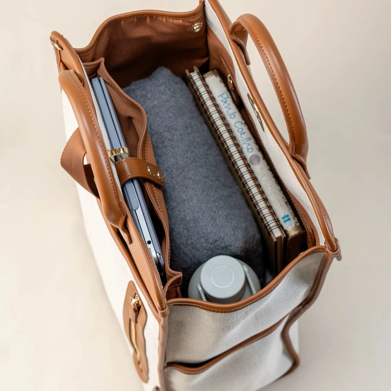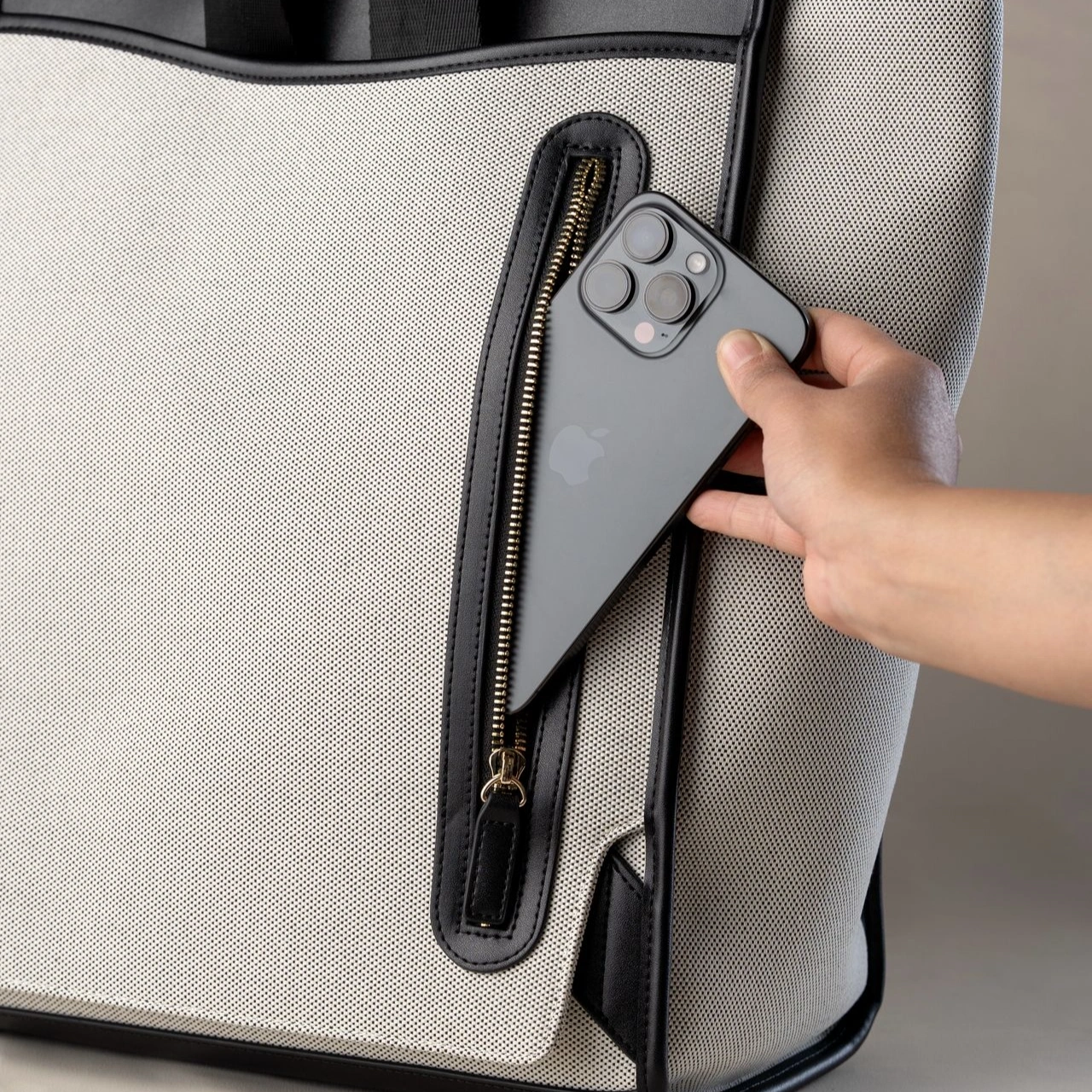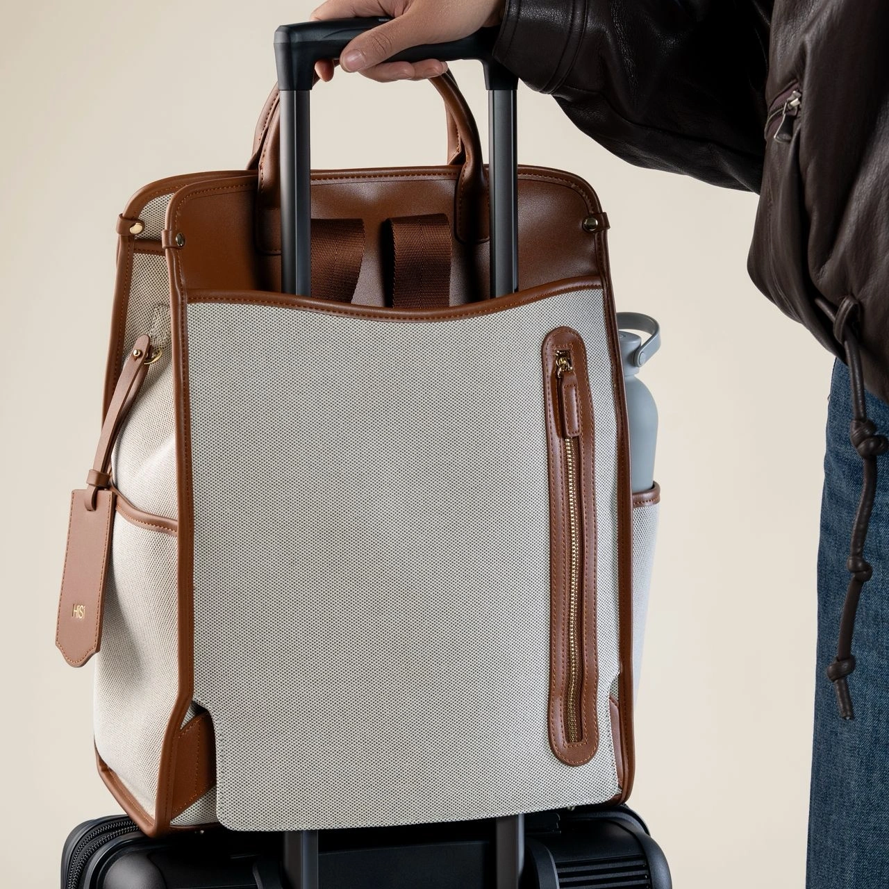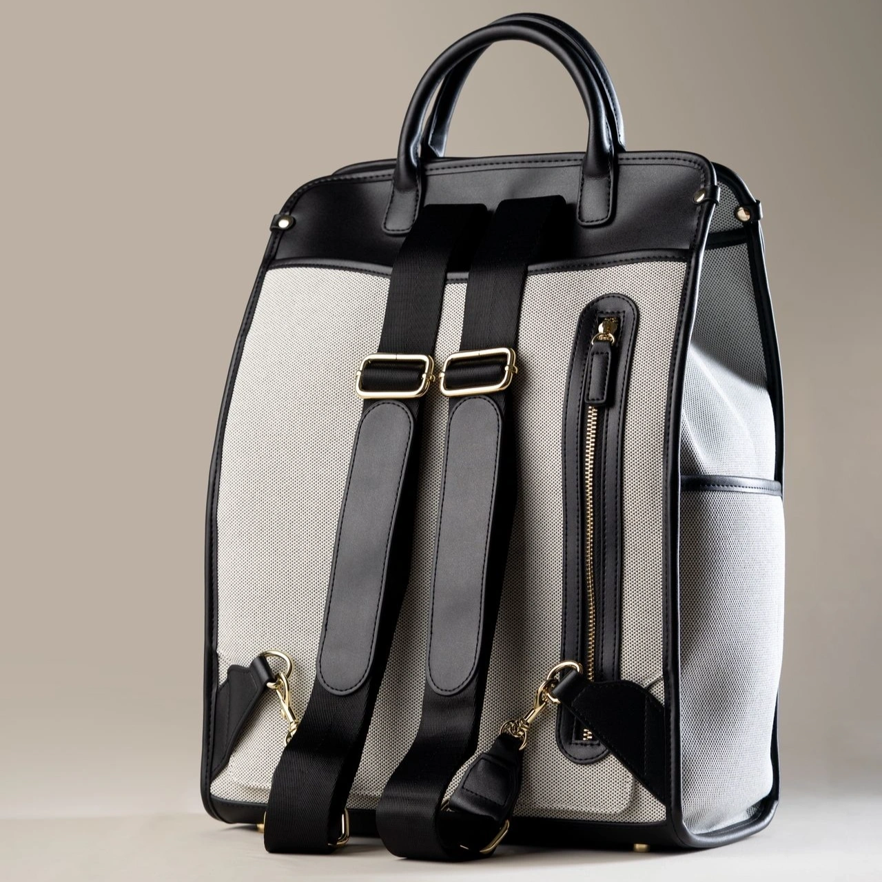 Crafted with high-quality vegan leather and canvas, this elegant multi-purpose bag is designed for modern lifestyle.Wear it as a backpack or carry it as a handbag, with the added covenience of a suitcase sleeve for effortless travel.