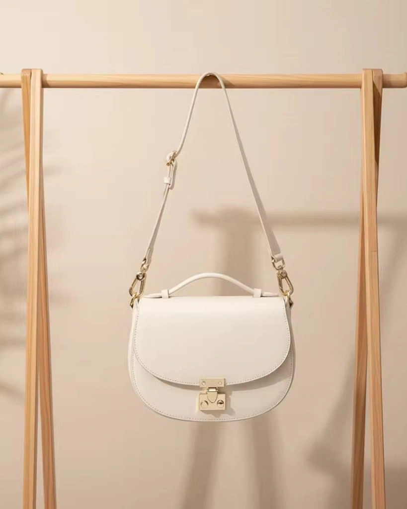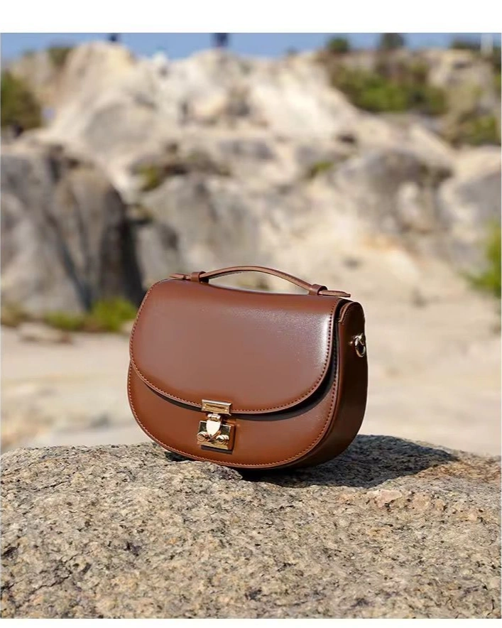 This is a sleek minimalist saddle-styled bag crafted from cowhide leather with adjustable shoulder strap and a carry handle.