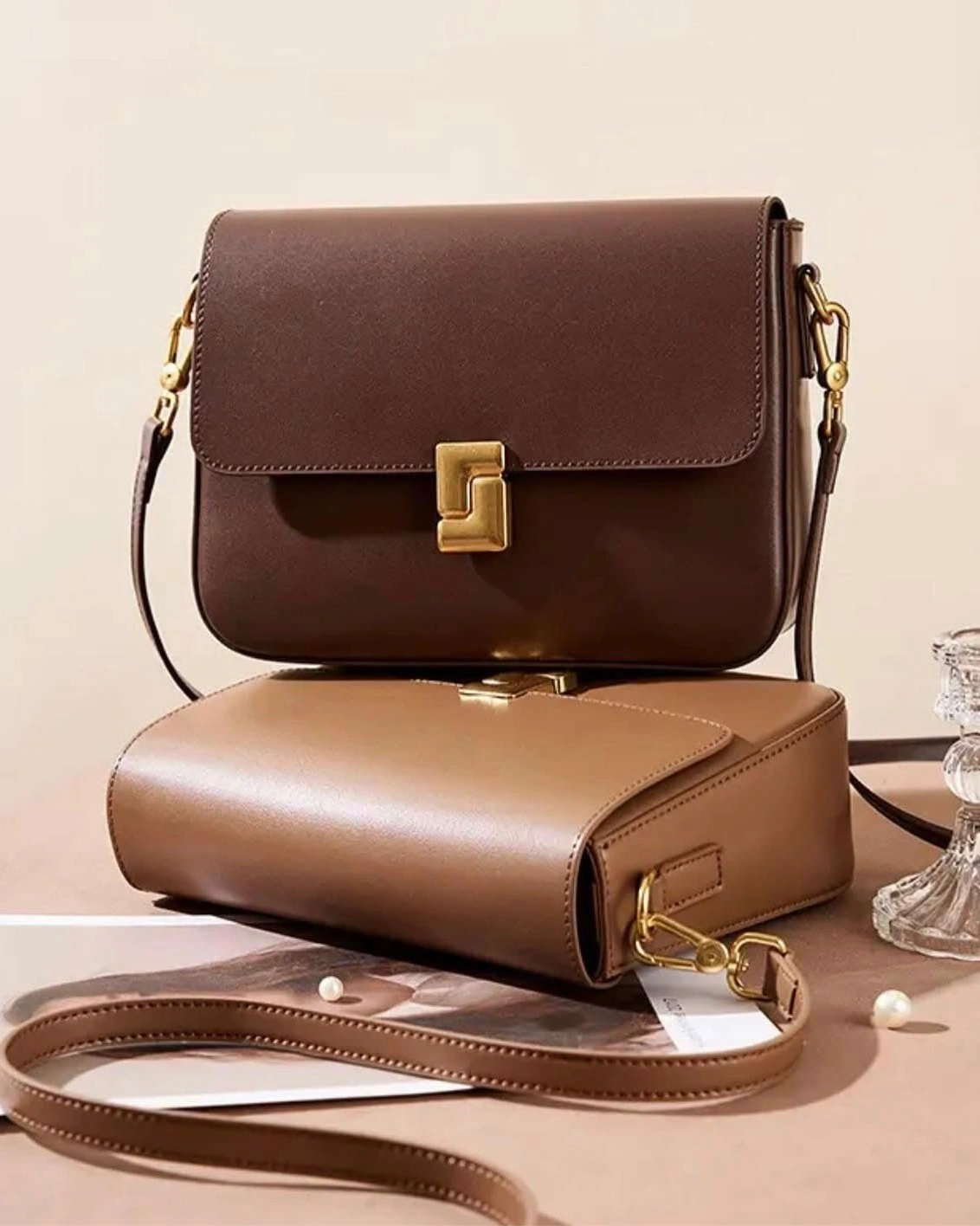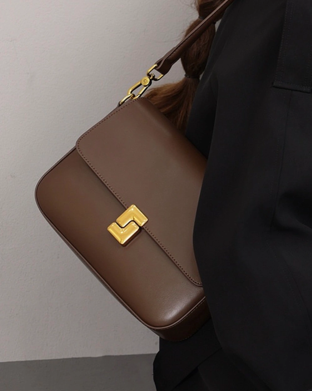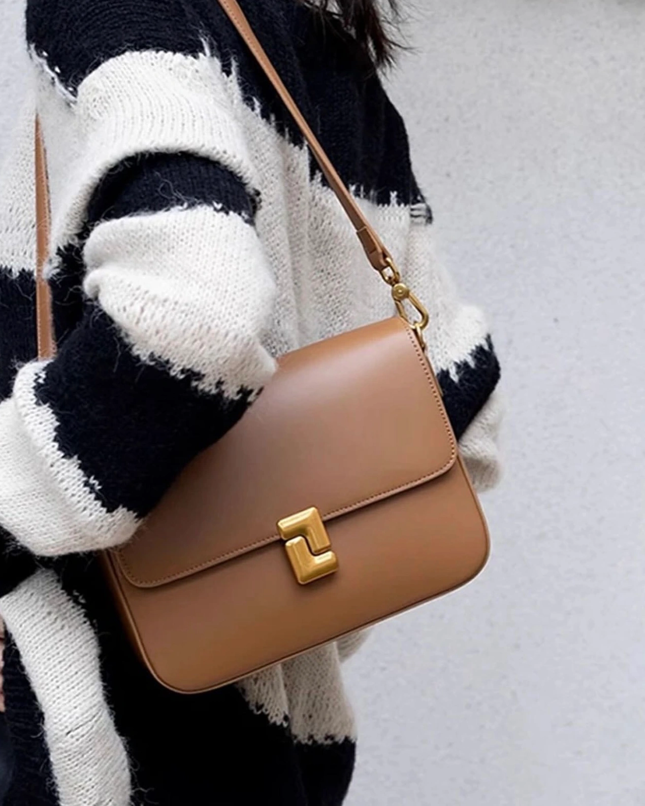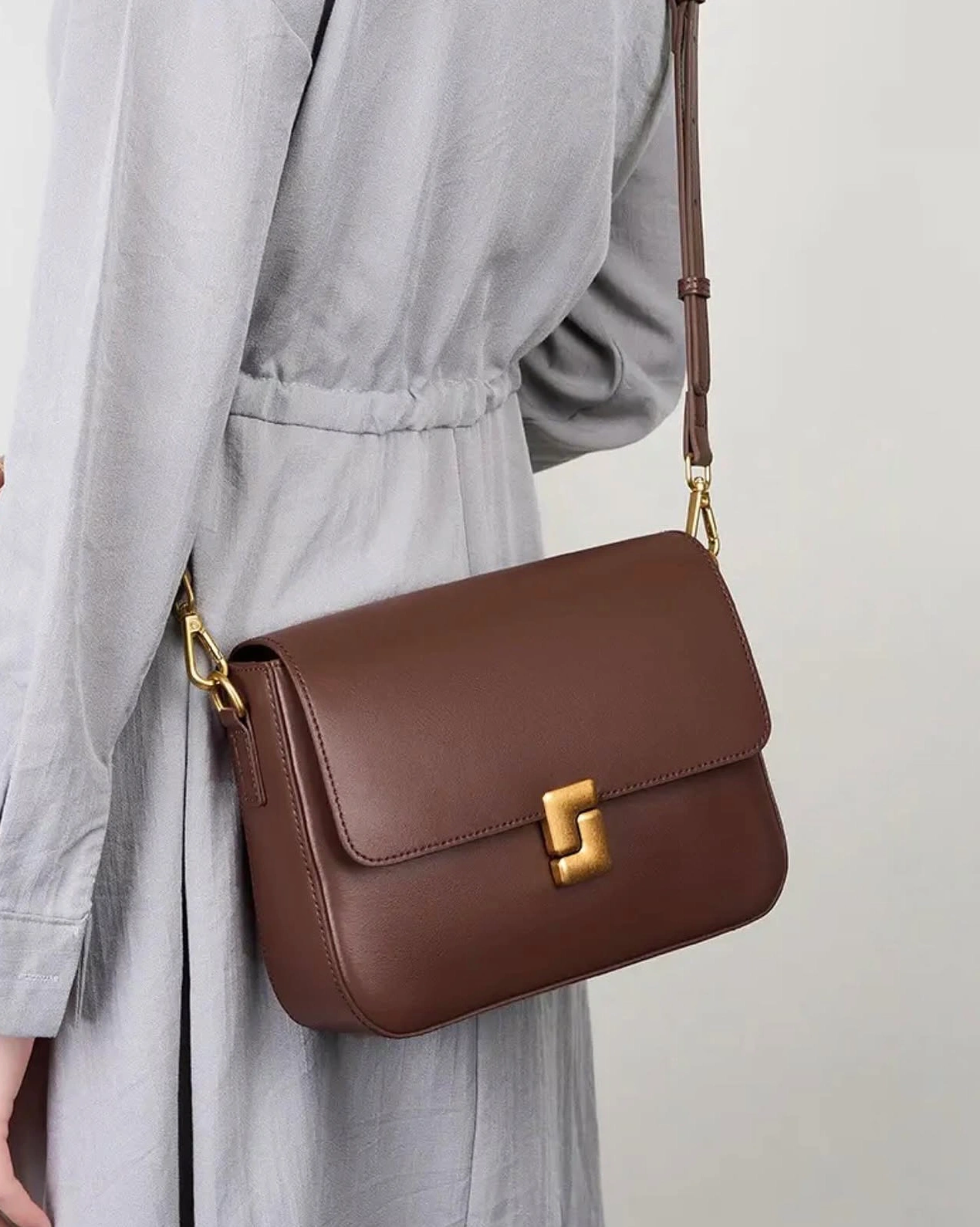 This vintage-inspired box bag is a structured, minimalist crossbody crafted from premium leather, featuring a signature geometric gold-tone clasp.