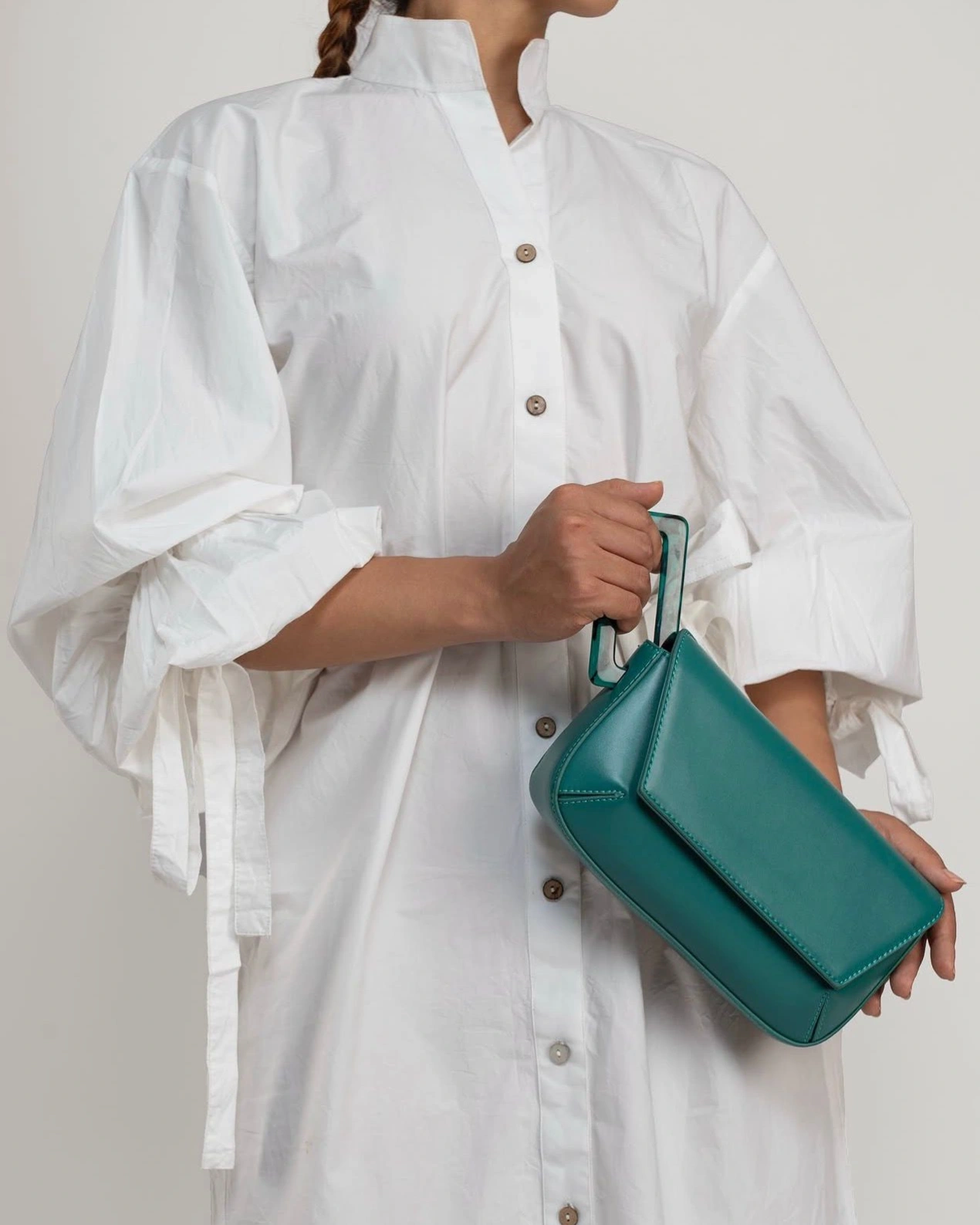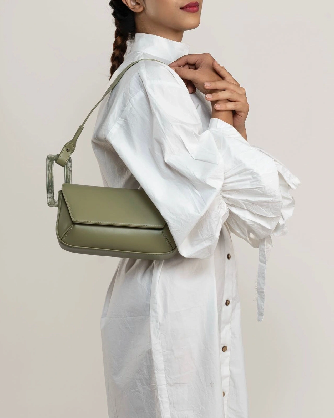 A sleek and modern clutch designed for effortless elegance.Crafted with structured silhouttee and minimal detailing,it features a unique handle and a detachable strap, allowing you to carry it as a chic shoulder bag.