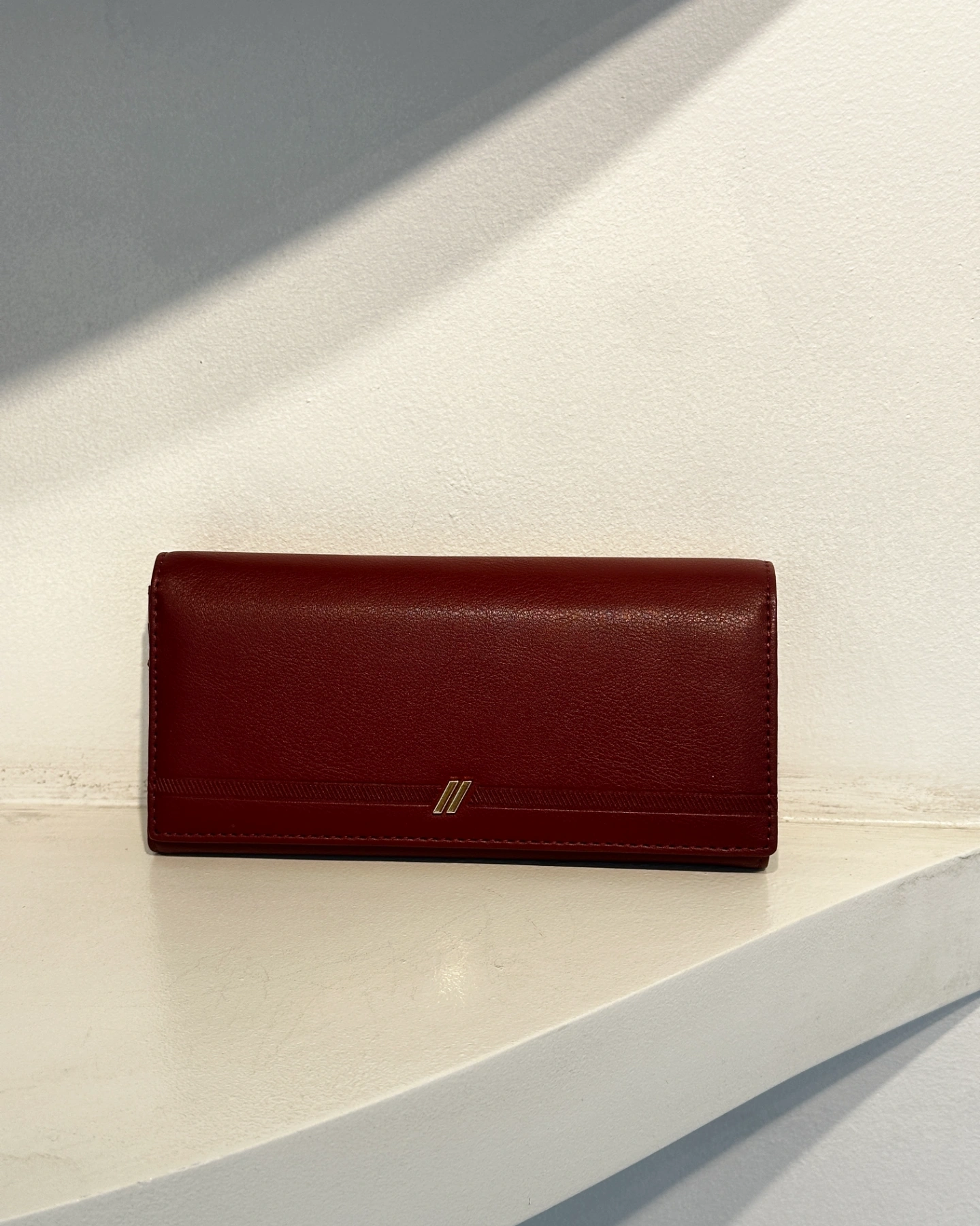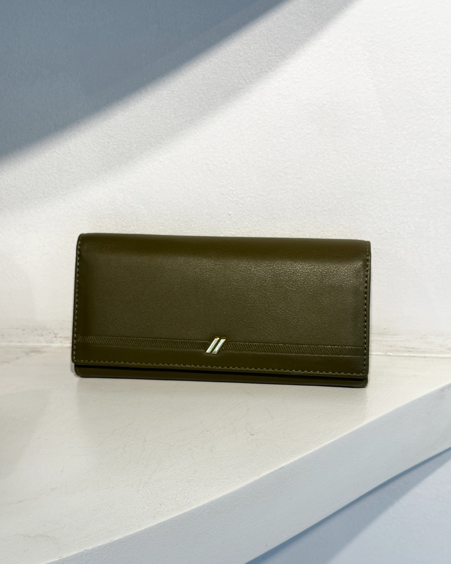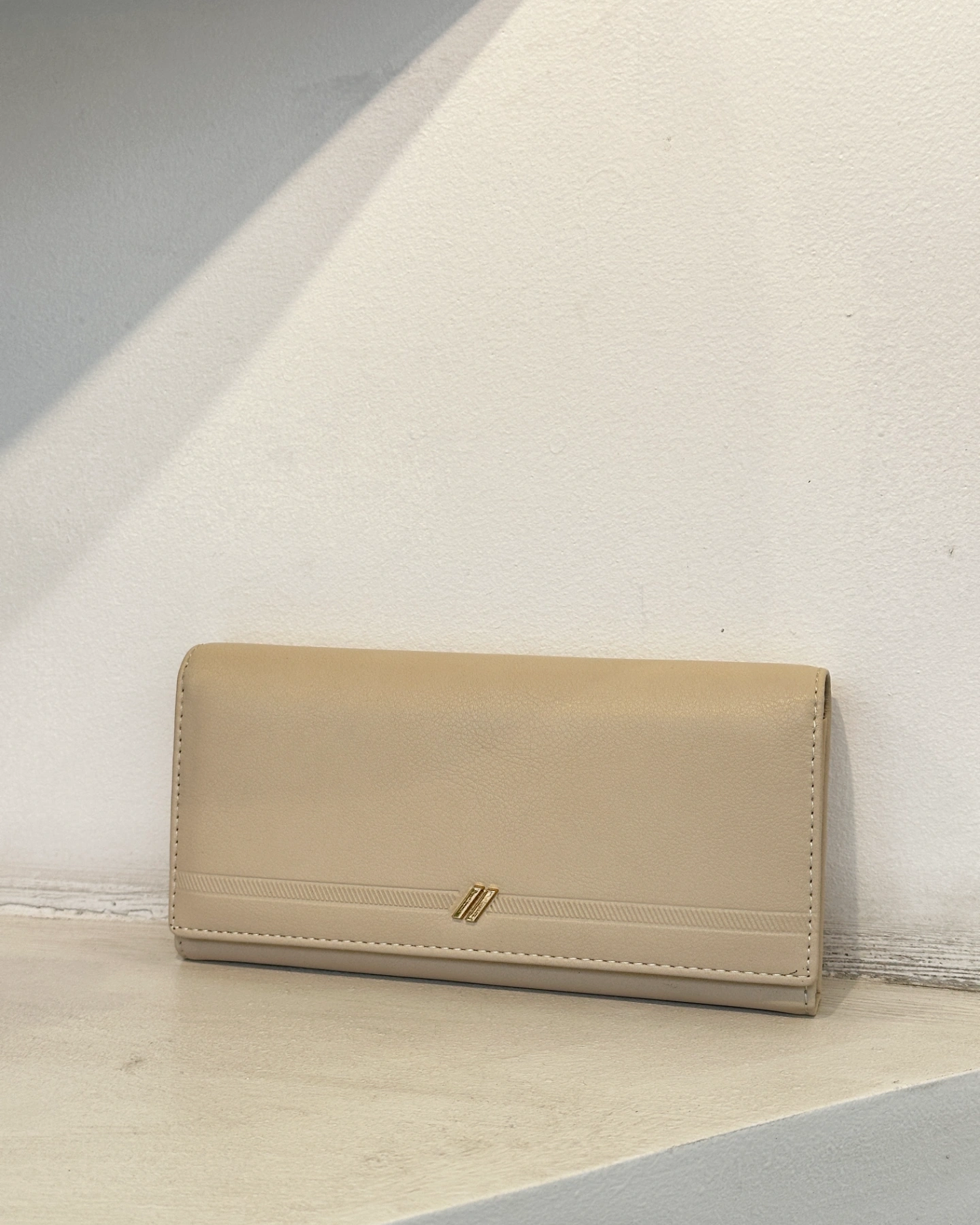 A sophisticated, trifold long wallet designed for modern convenience. It features a spacious interior for cash and cards, with a secure closure that makes it ideal for use as a standalone hand clutch or a slim organizer for larger bags.
